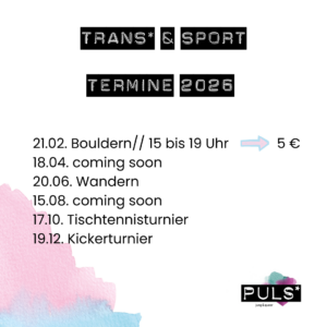 Jeden dritten Samstag im Monat findet unser Trans & Sport Angebot statt. Das kann im PULS* sein (Corneliusstr. 28, 40215 Düsseldorf) oder auch an anderen Orten in Düsseldorf und der näheren Umgebung.