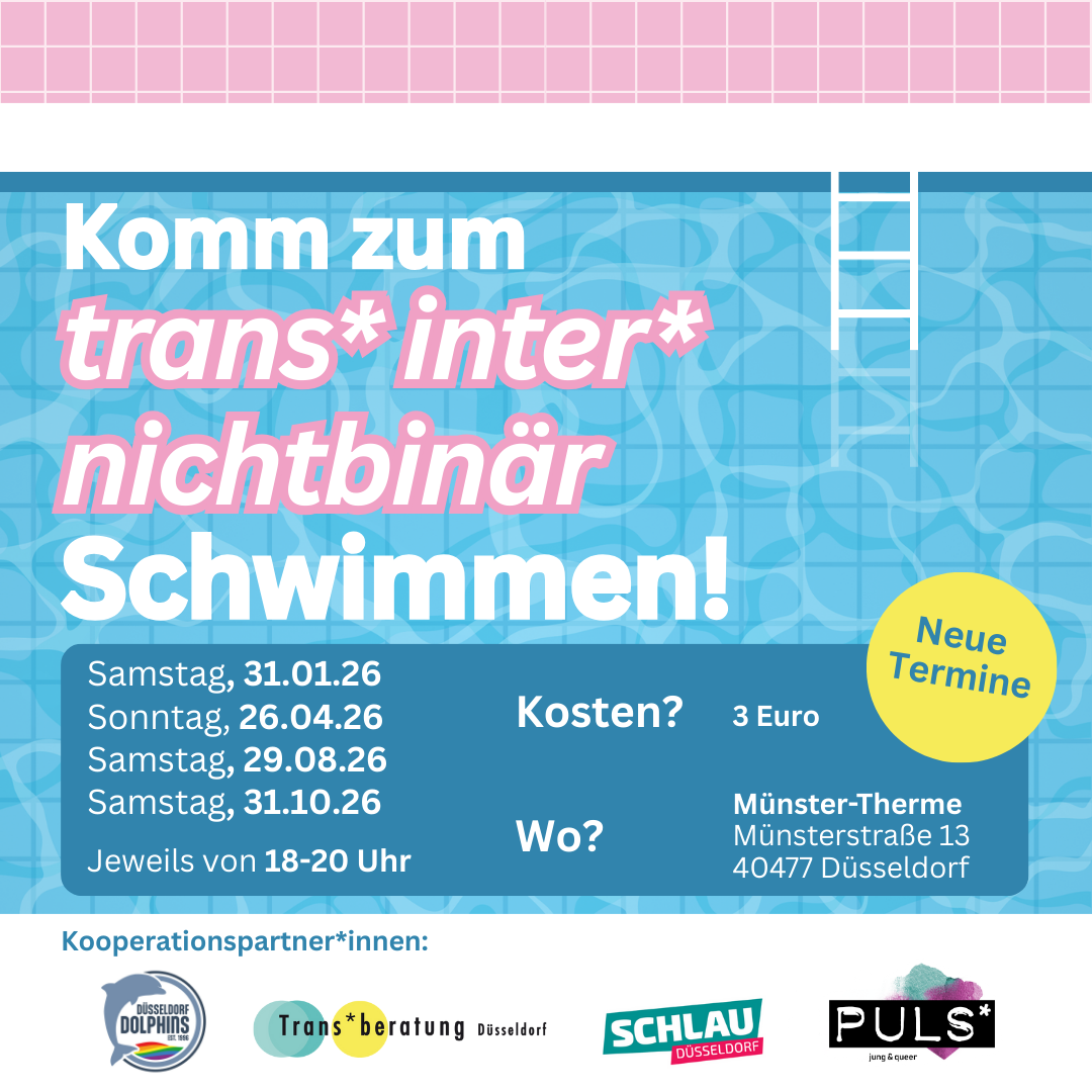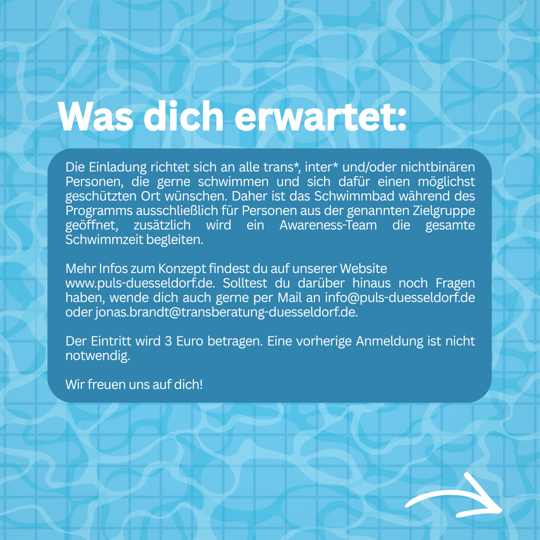 Während der Schwimmzeit wird ein*e Rettungsschwimmer*in und Bademeister*in Vorort sein. (Wichtig: Es kann sein, dass diese Personen auch cis-geschlechtlich sind.)